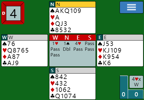 东家的加倍不可能是寻找配合的技术性加倍,因为,既然没有能力在1♥后做技术性加倍,就更不可能有能力在4♥后做技术性加倍,所以这个加倍是惩罚性的。西家即使有牌型和一定牌力,他也不会叫4♠或5♦.